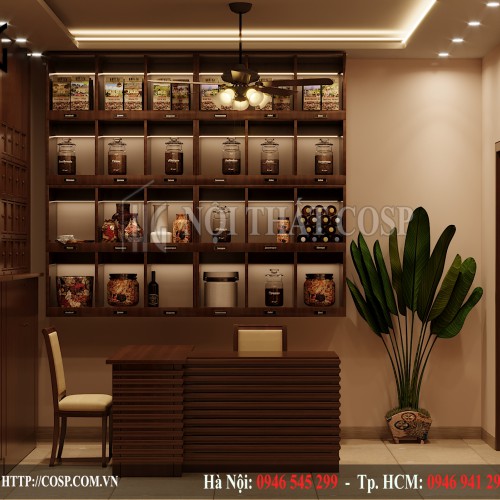 Thiết kế phòng khám châm cứu - phòng chuẩn đoán sử dụng hệ thống quầy tủ thuốc sát tường để tận dụng nhiều không gian, Chất liệu gỗ công nghiệp được phủ thêm lớp sơn với độ bóng cao và khả năng ngăn ẩm mốc, cong vênh, bảo quản thuốc được lâu hơn, tránh bị hư. Bề mặt nhờ được phủ thêm lớp sơn với độ bền cao và dễ dàng vệ sinh.
