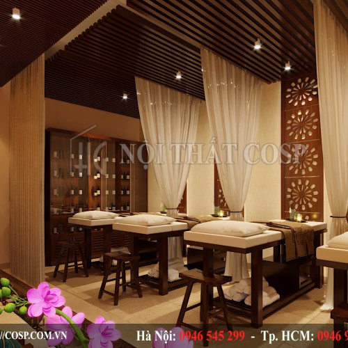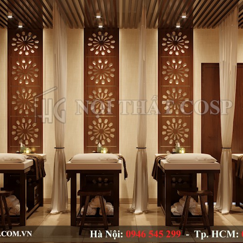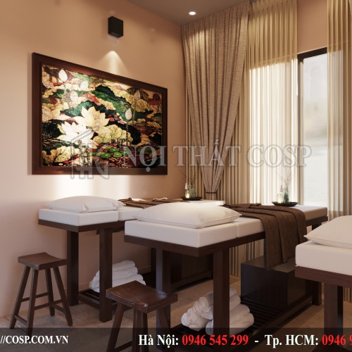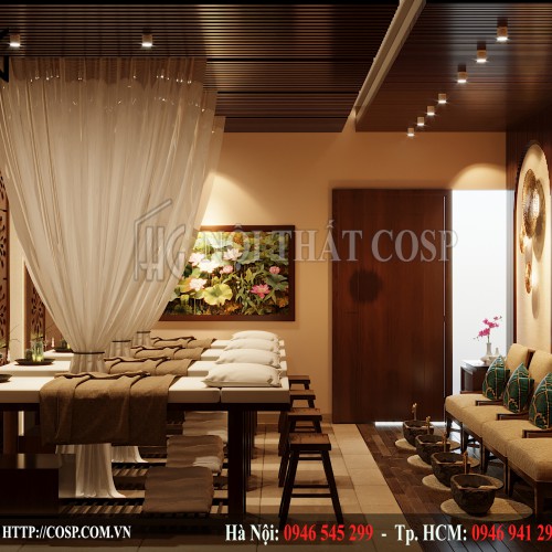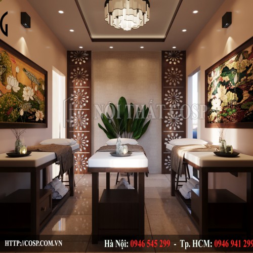 Bên cạnh đó, chúng tôi cũng lấp đi những mảng tường trống bằng tranh nghệ thuật treo tường hay môt vài tấm rèm có màu sắc dịu nhẹ giúp các giác quan của khách hàng được nghỉ ngơi và thư giãn.