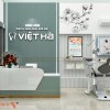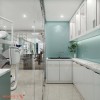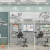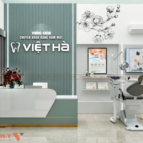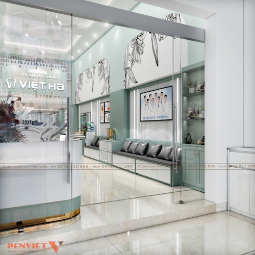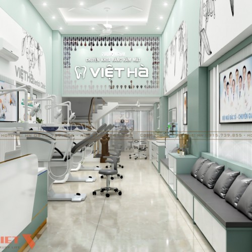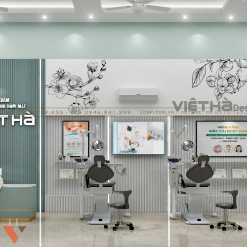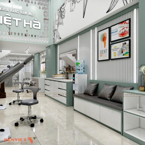 Thiết kế phòng khám răng hàm mặt Việt Hà là sự kết hợp của 2 tone nhã nhặn màu trắng và xanh dương nhạt tạo nên không gian nha khoa tươi sáng, sang trọng. Thêm vào đó, kiến trúc sư còn kết hợp trang trí décor nhiều tranh in PP tạo điểm nhấn ấn tượng cho nội thất nha khoa.