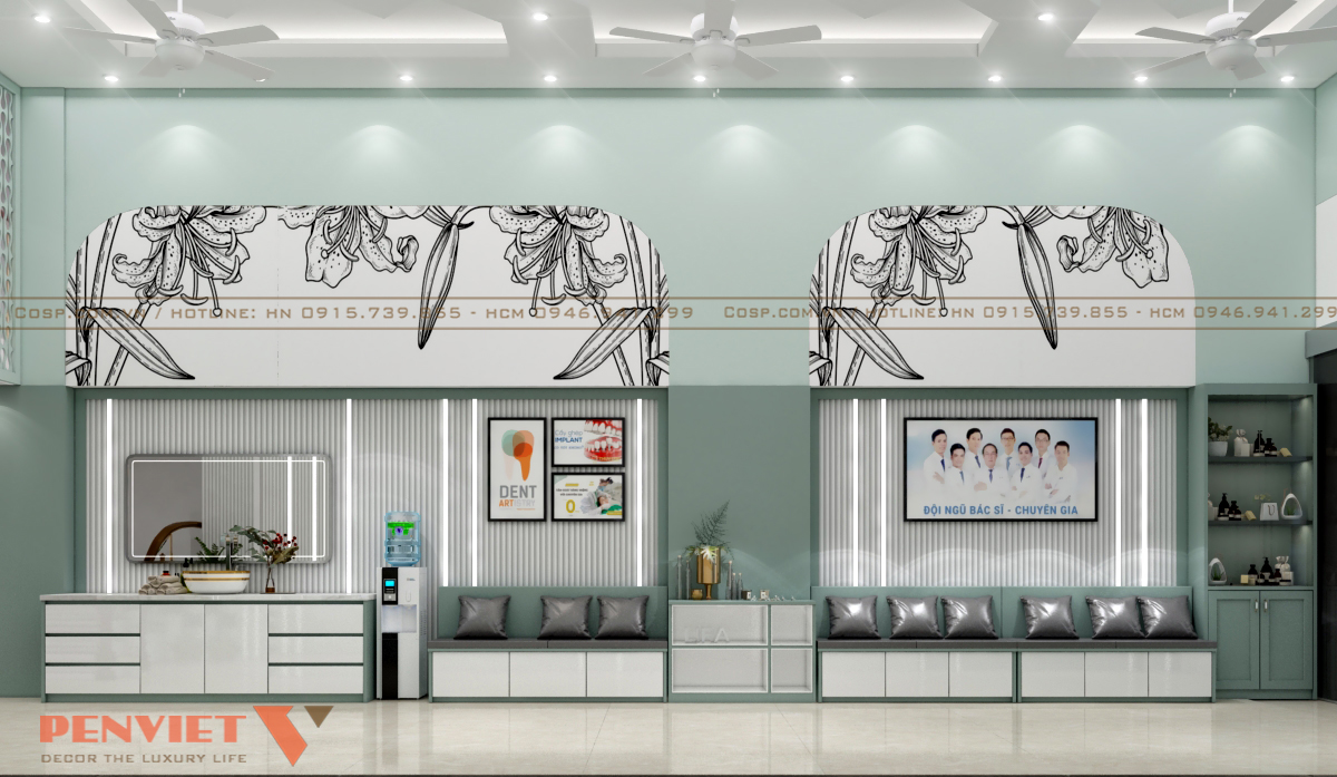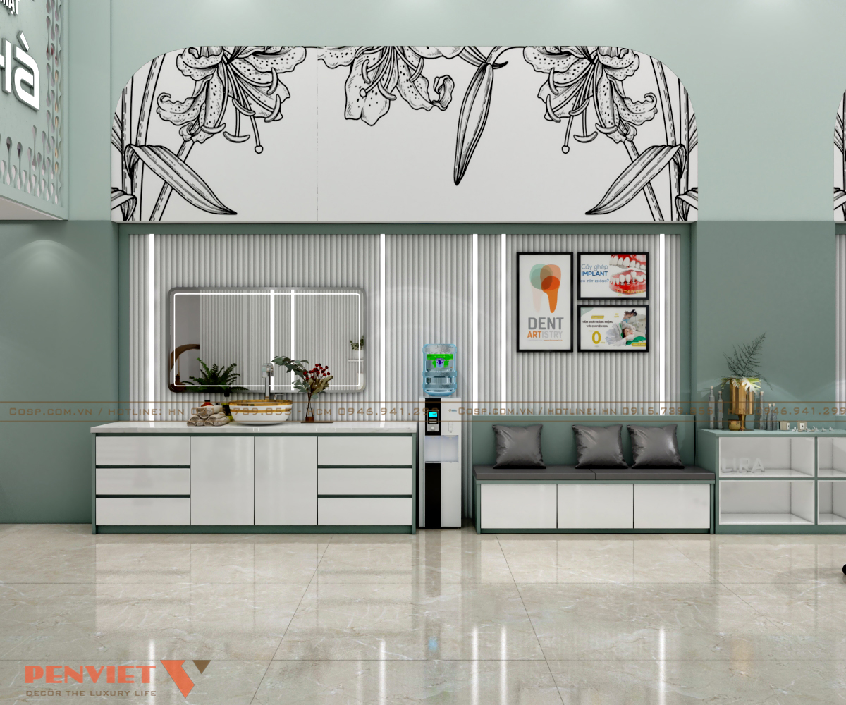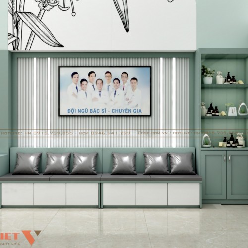Khách hàng chờ thăm khám được chuẩn bị ghế bọc đệm êm ái. Hệ tủ trang trí được sắp xếp xen kẽ để khách hàng có thể để đồ giúp không gian gọn gàng sạch sẽ.