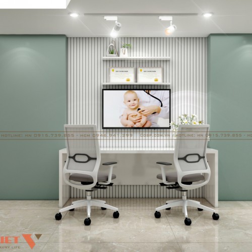 Bàn làm việc gỗ MDF thiết kế đơn giản cùng ghế xoay thuận tiện cho bác sĩ trong quá trình tư vấn cho người bệnh.