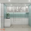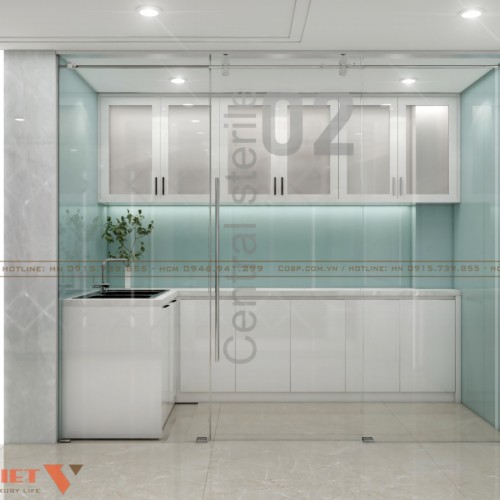 Phòng vô trùng sử dụng hệ tủ lưu trữ vật tư y tế kết hợp lavabo. Tủ là sự kết hợp giữa gỗ mdf và mặt tủ sử dụng mặt PVC vân đá dễ dàng vệ sinh.