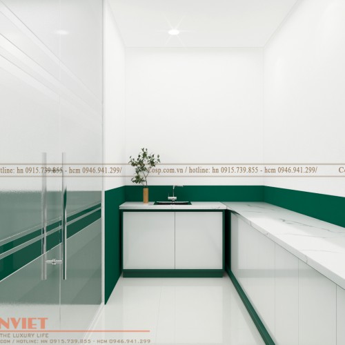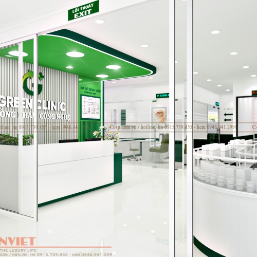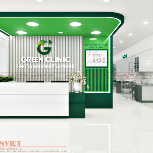 Màu sắc chủ đạo: Thiết kế phòng khám đa khoa Green clinic sử dụng tông màu trắng và xanh lá cây chủ đạo. Màu trắng kết hợp với màu xanh lá cây có thể tạo nên tổng thể phòng khám sang trọng, tối ưu không gian mà vẫn tạo được cảm giác gần gũi, thân thiện.
