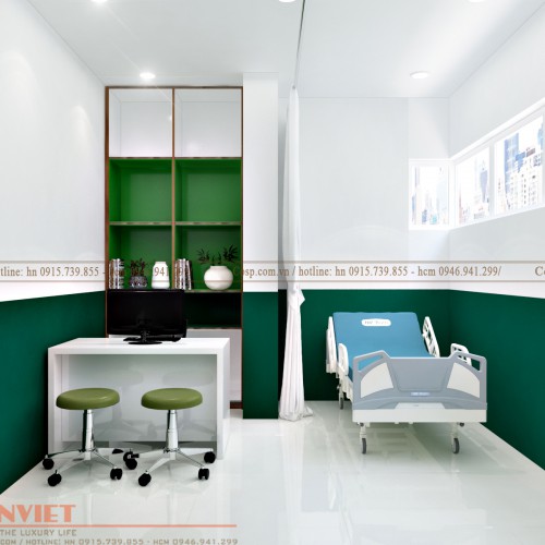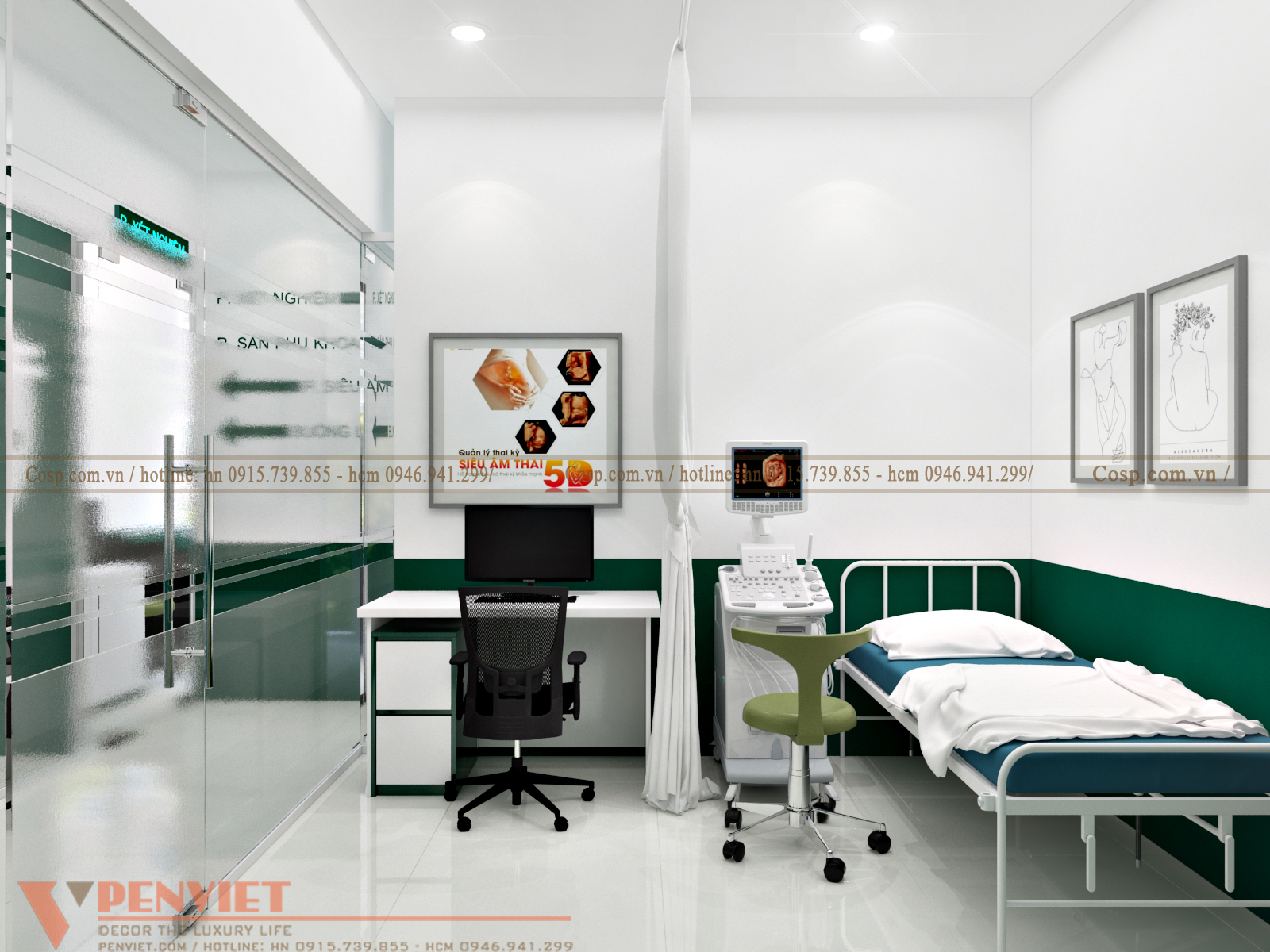 Thiết kế phòng khám sản được tiết chế các vật dụng trang trí rực rỡ, tranh trang trí, đồ nội thất không cần thiết. phòng khám được tối ưu một các tối đa để có thể có vị trí đặt các vật dụng y tế cần thiết mà không gây cản trở việc di chuyển của bác sĩ và bệnh nhân.