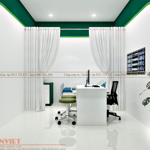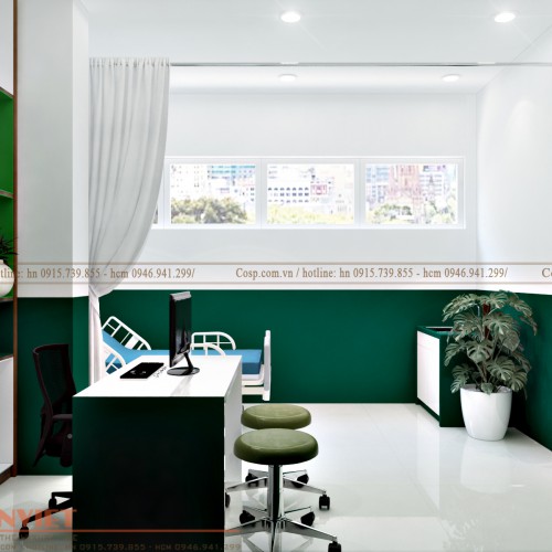 Thiết kế phòng khám sử dụng các tông màu dịu nhẹ mang đến cảm giác rộng rãi, ôn hòa, không nóng, không lạnh. Hệ nội thất được sử dụng bao gồm bàn thăm khám, tủ lưu trữ thông tin giấy tờ treo tường, tủ bảo quản vật dụng y tế sát tường kết hợp bồn rửa vệ sinh.