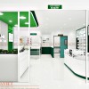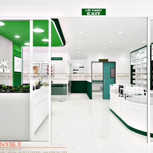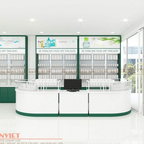 Đối diện quầy lễ tân được bố cục quầy thuốc phục vụ khách hàng. Quầy thuốc sử dụng hệ nội thất bao gồm tủ thuốc sát tường và tủ thuốc giữa nhà kết hợp với bàn thanh toán.