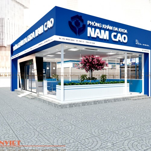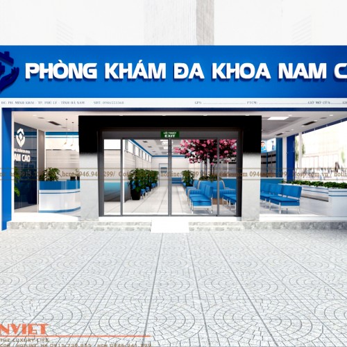 Thiết kế mặt tiền phòng khám đa khoa Nam Cao lựa chọn tông màu chủ đạo là trắng và xanh – đây màu nhận diện của thương hiệu. Phối hợp màu sắc có tính đồng nhất ở 2 mặt tiền và nội thất bên trong tạo nên tổng thể thiết kế phòng khám đa khoa vô cùng chuyên nghiệp.
