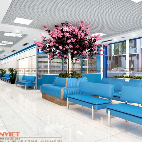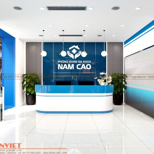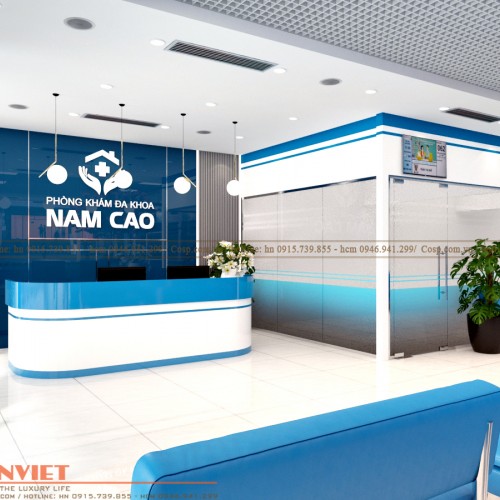 Với tiêu chí mang đến không gian phòng lễ tân thân thiện và chuyên nghiệp khi thiết kế phòng khám đa khoa Nam Cao. Kiến trúc sư đã sử dụng phong cách thiết kế hiện đại với tông màu trắng và xanh kết hợp tạo nên không gian hài hòa, thoải mái cho khách hàng. Bố trí những chậu cây nhỏ, làm tăng sức sống cho môi trường phòng khám đầy căng thẳng.