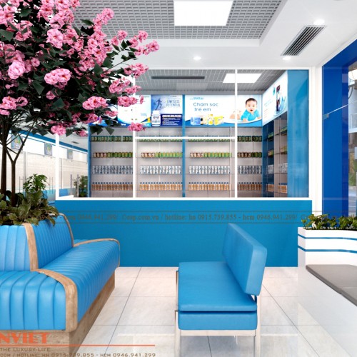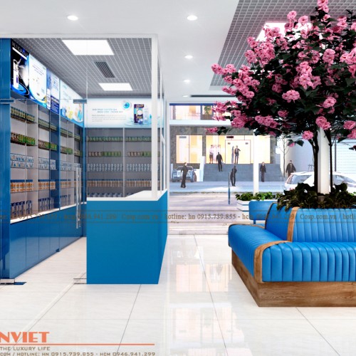 Tủ thuốc cao sát tường gỗ MDF chống ẩm phun sơn kết hợp với kính cường lực vừa tạo được nhiều không gian trưng bày thuốc, vừa đảm bảo tính thẩm mỹ cho không gian. Bàn tư vấn và đưa thuốc cho khách hàng được thiết kế vừa tầm giúp y bác sĩ thoải mái ngồi và khách hàng cũng dễ dàng quan sát hơn.