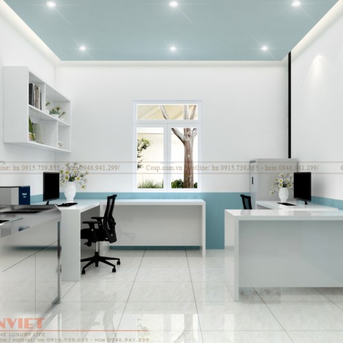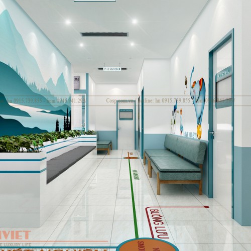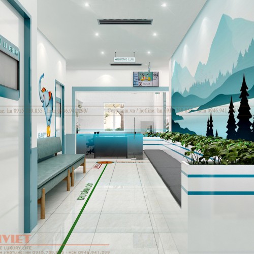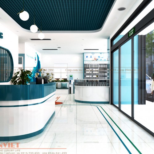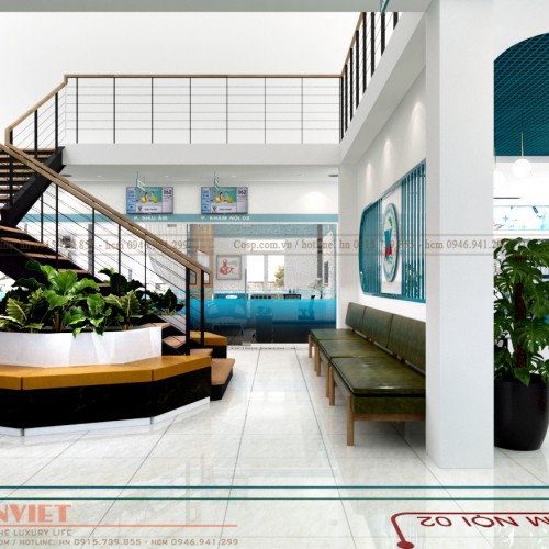 - Ý tưởng thiết kế: Thiết kế phòng khám đa khoa phong cách hiện đại, với tông màu trắng kết hợp với xanh mang lại không gian thăm khám, tiếp đón bệnh nhân chuyên nghiệp nhất.