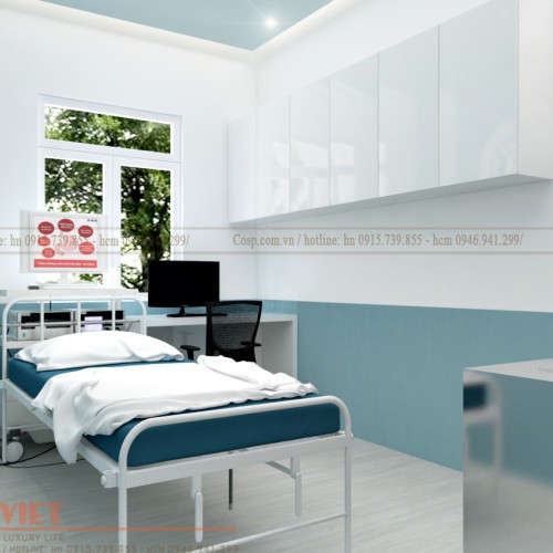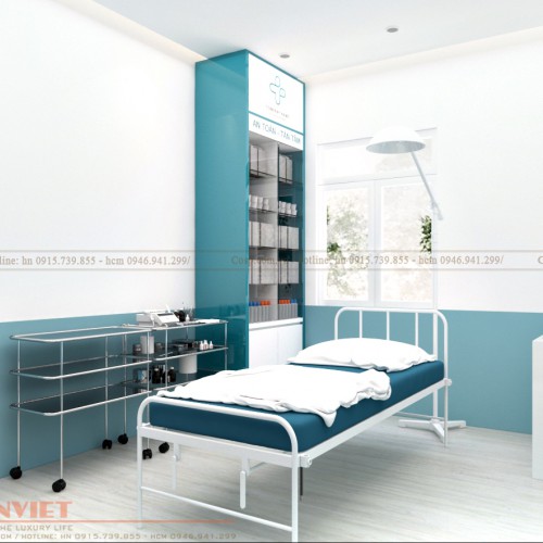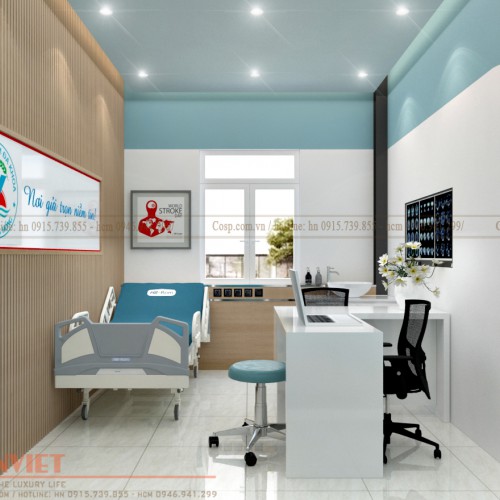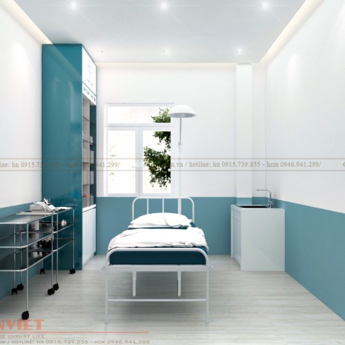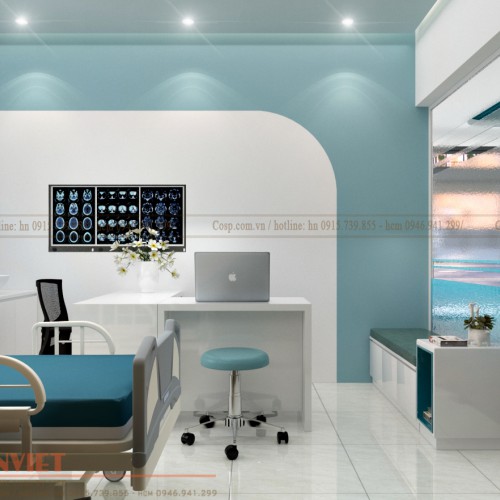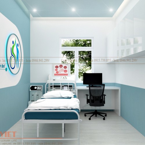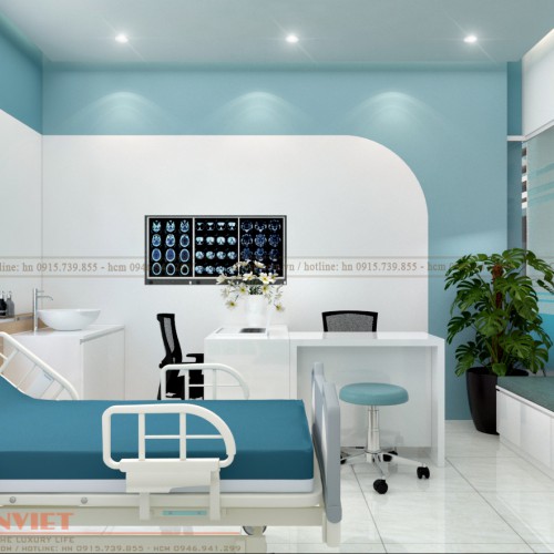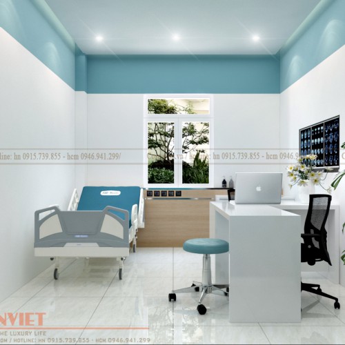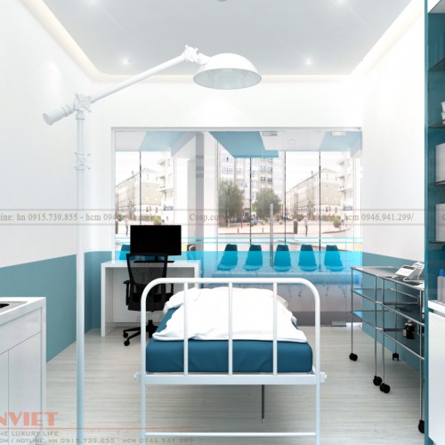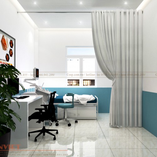 Nội thất của phòng khám được thiết kế theo phong cách hiện đại đang được ưa chuộng. Bố cục nội thất phòng khám đơn giản với một giường khám, bàn làm việc của bác sĩ, tủ lavabo và ghế ngồi chờ.