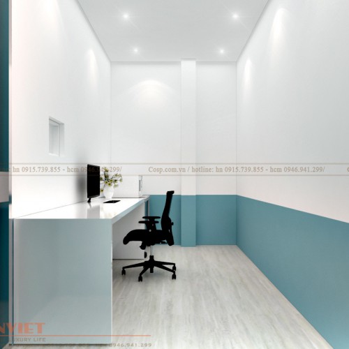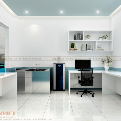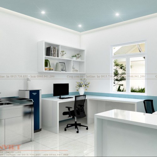 Bố trí nội thất không gian phòng xét nghiệm bao gồm hệ bàn làm việc văn phòng, và tủ gỗ treo tường để đựng đồ giúp tiết kiệm tối đa không gian cho phòng. Ngoài ra, phòng xét nghiệm còn được sắp đặt bộ bồn rửa tay sạch sẽ và có ngăn kéo để đồ tiện dụng.