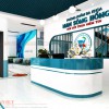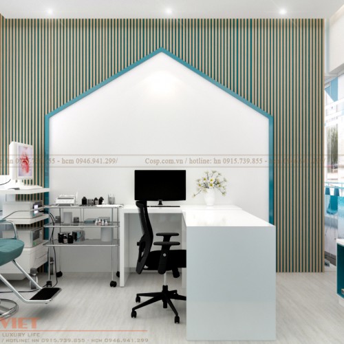 Ở đây chúng tôi sử dụng quầy lễ tân theo dạng chữ I là một lựa chọn vô cùng thông minh và khéo léo. Thương hiệu phòng khám được làm nổi bật ở vách ngăn phía sau giúp khách hàng sẽ có ấn tượng ngay khi bước vào phòng khám.