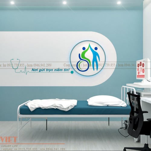 Để tăng sự chuyên nghiệp cho mẫu thiết kế phòng khám đa khoa, kiến trúc sư đã khéo léo sắp đặt logo thương hiệu ở phòng khám. Ở đây, chúng tôi đã cải tạo vách tường bằng việc sử dụng vách nan gỗ giúp tôn lên logo thương hiệu mica nổi bật.