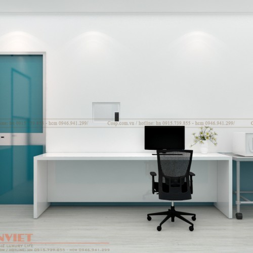 PenViet bố trí bàn làm việc bằng gỗ MDF chống ẩm phủ Melamine và ghế xoay tạo sự thuận tiện cho bác sĩ khi di chuyển.