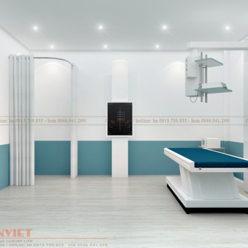 Phòng chụp X Quang được phân chia thành 2 phòng chức năng như phòng chờ, đưa kết quả và phòng đặt máy X quang. Bố cục đơn giản không có quá nhiều đồ nội thất.