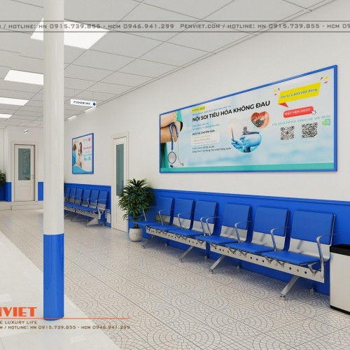 Dọc hành lang bệnh viện được setup thêm các biển chỉ dẫn bằng Alu và bộ chữ tên khu vực bằng Mica trước mỗi phòng chức năng và hệ ghế ngồi đợi chờ. Điều này mang lại sự thuận tiện cho các cán bộ nhân viên cũng như bệnh nhân và người nhà đến đây thăm khám.