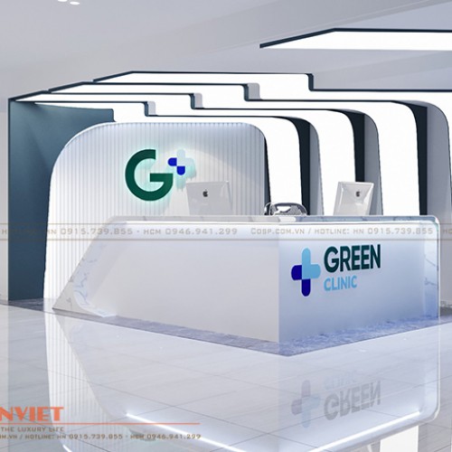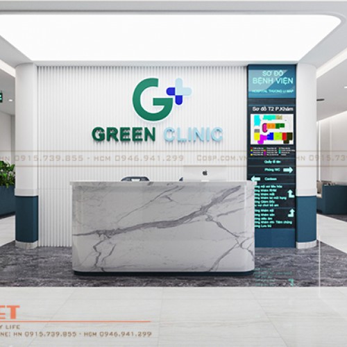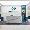 Logo và bộ chữ “GREEN CLINIC” bằng Mica phát sáng mặt được đặt ở trung tâm, hai bên là những bộ chữ Alu vàng gương chân phát sáng mang đến vẻ đẹp đơn giản, hiện đại cho mẫu thiết kế.