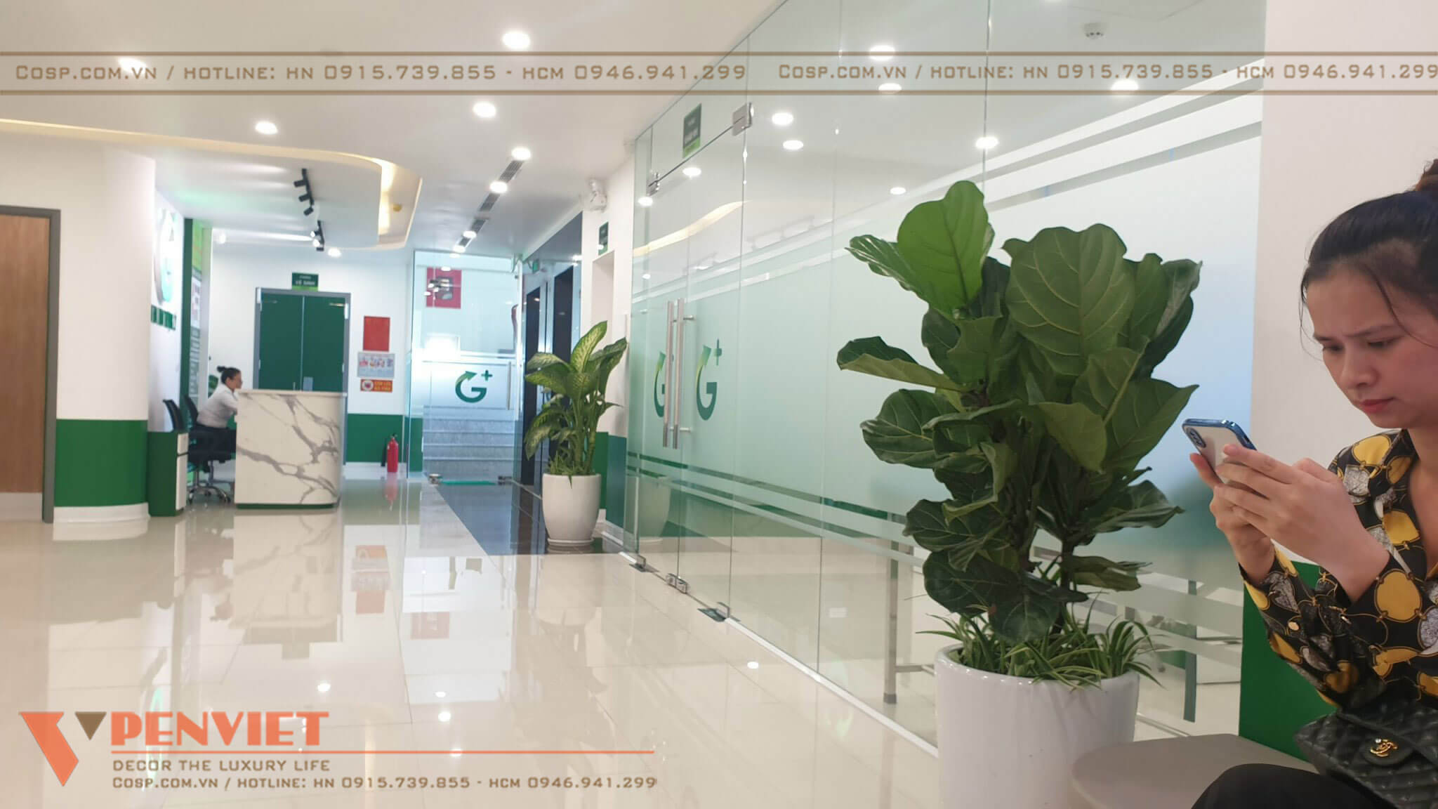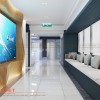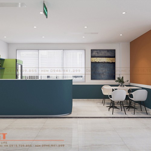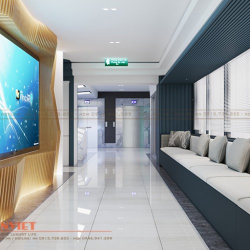 Sự liên kết không gian được thể hiện thông qua việc sử dụng background đặc trưng trong các quầy lễ tân và biển, tranh chỉ dẫn. Tuy khu vực tiếp đón tại tầng 2 được Penviet thiết kế đơn giản hơn, song vẫn cho thấy sự hiện đại, sang trọng thông qua việc sử dụng gỗ MDF lõi xanh chống ẩm và đá trắng vân mây nhân tạo cho quầy đón khách.