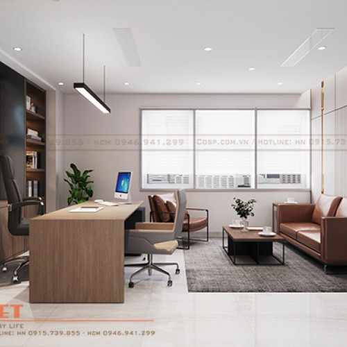 Tone màu nâu được sử dụng để làm điểm nhấn cho thiết kế phòng giám đốc, kết hợp với việc sử dụng nội thất tinh tế mang đến sự trang trọng cho không gian.