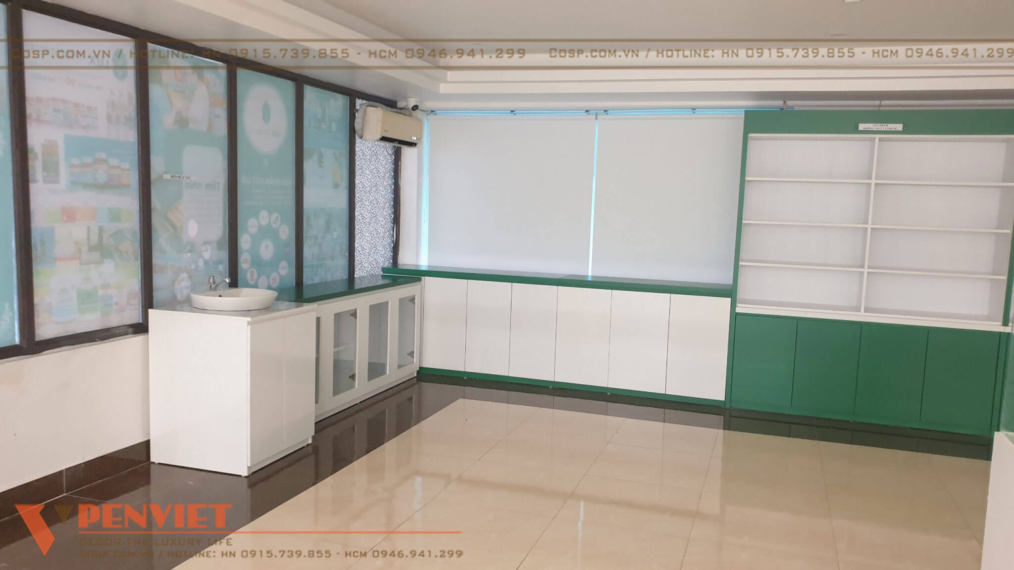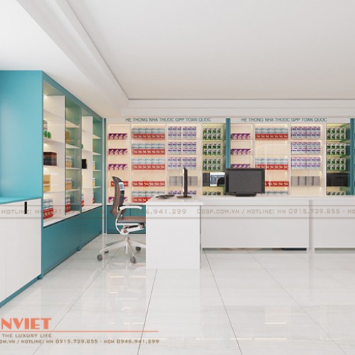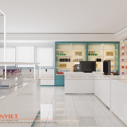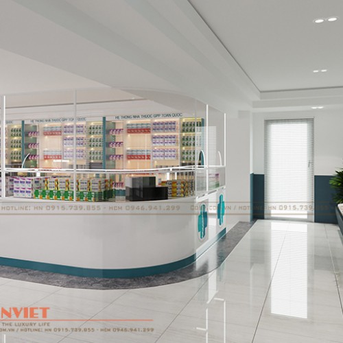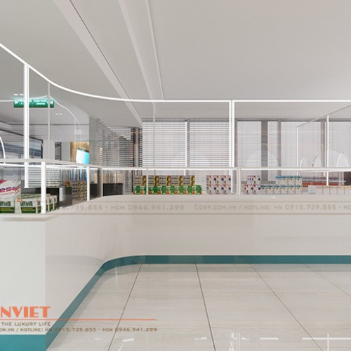Thiết kế tủ thuốc độc đáo sử dụng gỗ MDF lõi xanh chống ẩm phun sơn Inchem khéo léo tạo nên không gian làm việc riêng tư cho nhân viên nhưng vẫn đảm bảo được việc tiếp xúc, tư vấn khách hàng được diễn ra thuận lợi.