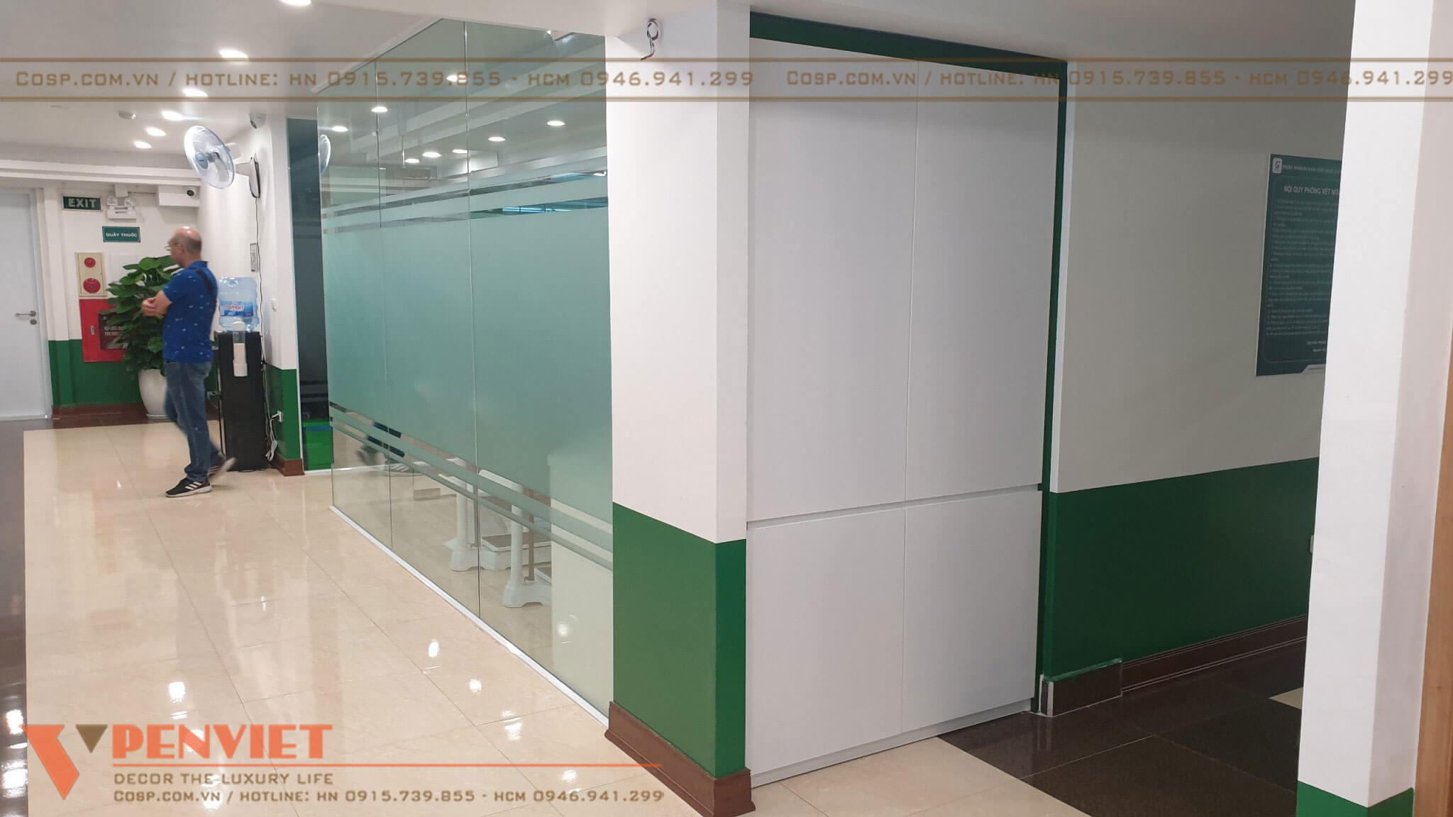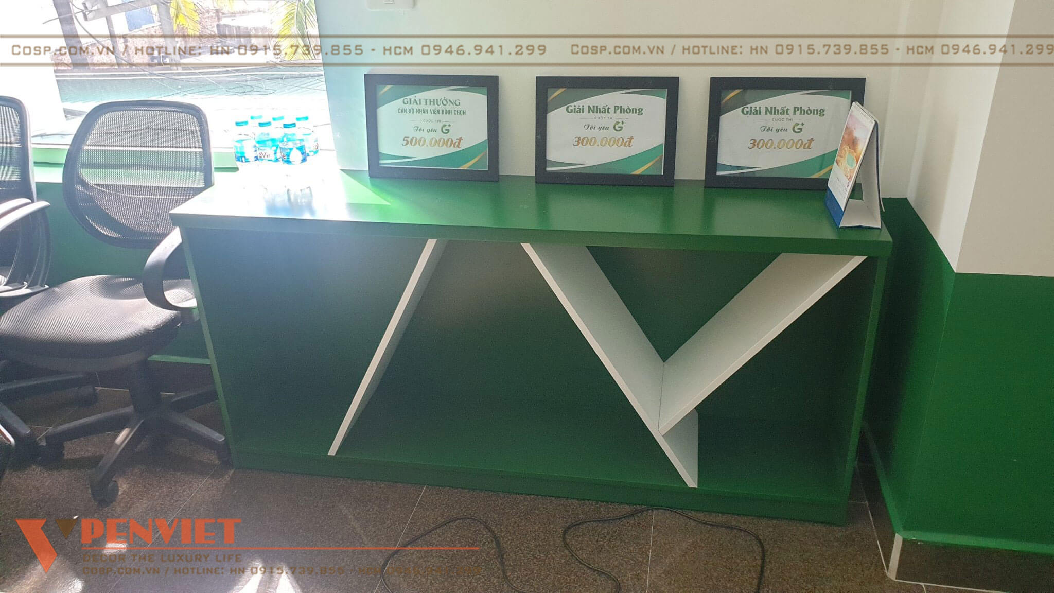 Bộ nhận diện thương hiệu bằng Mica chân phát sáng cắt CNC một lần nữa được Penviet khéo léo nhắc lại trong mẫu vách làm từ khung gỗ MDF chống ẩm phun sơn Inchem, giật cấp vào trong là gỗ Plawood.