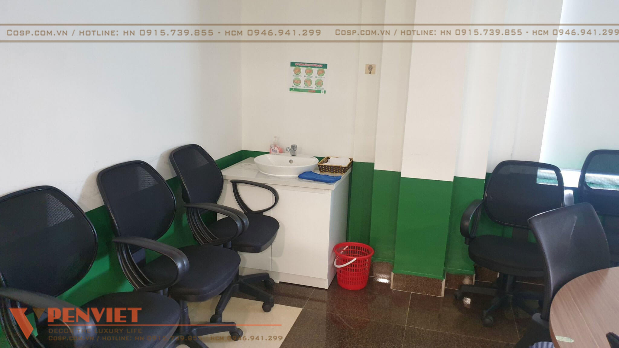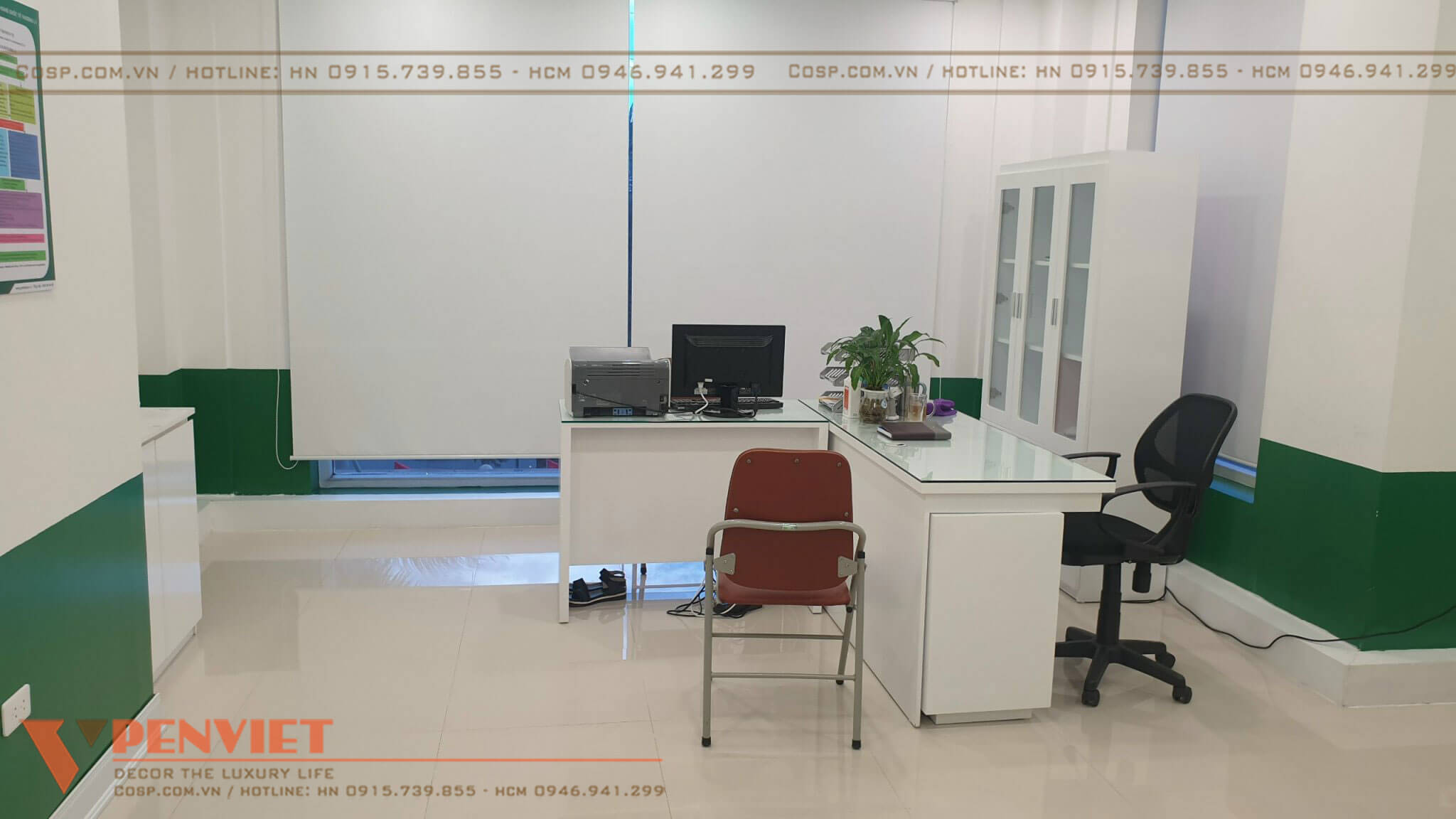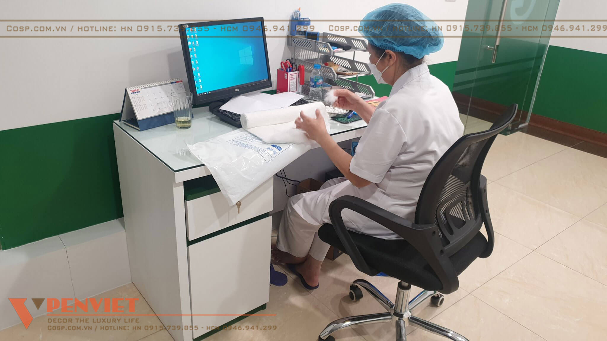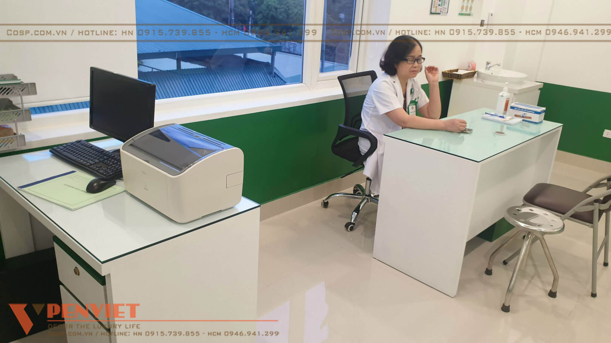Chúng tôi sử dụng đồng bộ mẫu bàn ghế, tủ tài liệu, kết hợp tinh tế các loại vật liệu nội thất mang đến hình ảnh chuyên nghiệp cho cơ sở khám chữa bệnh này.