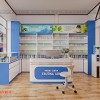 Thiết kế tủ thuốc tây có đợt kính trưng bày, đảm bảo nhân viên dễ tìm, dễ kiểm tra và quản lý. Lựa chọn chất liệu gỗ MDF cốt xanh chống ẩm, phủ melamin phối màu trắng và xanh dương dễ dàng cho công việc vệ sinh tủ thuốc và tẩy trùng khi cần thiết.