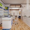 Do diện tích phòng khám nhỏ, kiến trúc sư đã thiết kế kết hợp phòng lễ tân và quầy thuốc. Thiết kế quầy thuốc đạt chuẩn GPP có tính thẩm mỹ và chuyên nghiệp. Thiết kế không gian có sự thông thoáng, lối đi rộng rãi, tiện lợi cho việc tìm kiếm sản phẩm thuốc