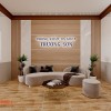 Vách logo phía sau sofa tiếp khách được cải tạo với sự kết hợp của 3 bộ vách đó là ốp gỗ melamin, ốp PVC vân đá, ốp lam nhựa.