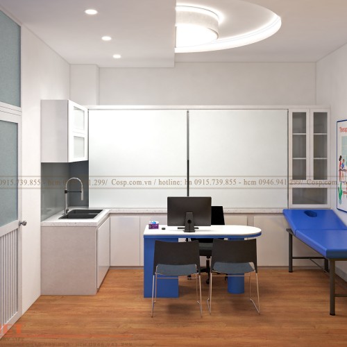 Hệ nội thất của phòng thăm khám bao gồm bàn làm việc của bác sĩ, tủ tài liệu và lavabo. Chất liệu được sử dụng cho đồ nội thất được lựa chọn kỹ càng có khả năng chống ẩm mốc, cong vênh mối mọt cao đảm bảo tuổi thọ lâu dài.