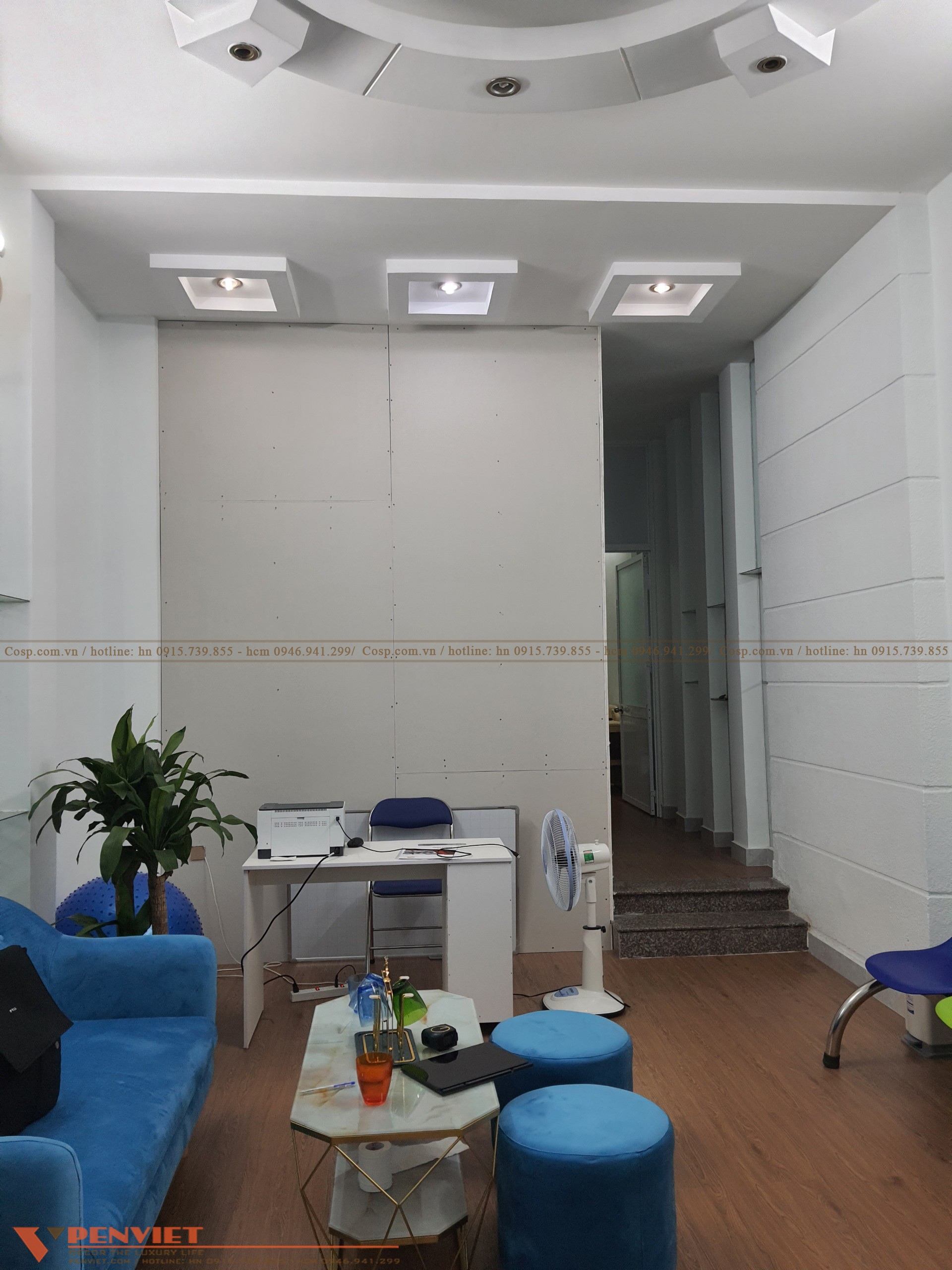 Penviet khéo léo giúp Phòng khám vật lí trị liệu tăng cường nhận diện thương hiệu nhờ setup vách logo thu hút với tấm Thạch cao + khung xương, sơn hoàn thiện tường nhà và nhận diện thương hiệu (logo, tên thương hiệu) bằng Mica không phát sáng.