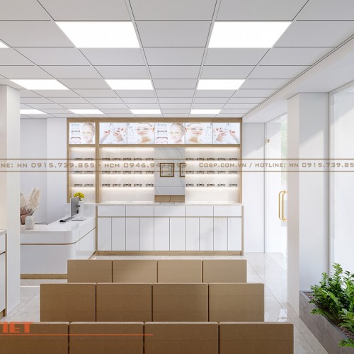 Không gian phòng khám mắt bác sĩ Nghĩa tại tầng 1 được PenViet phân bổ thành 4 khu vực. Trong đó gồm có dãy ghế ngồi chờ khách hàng, khu trưng bày sản phẩm kính mắt, quầy thu ngân và phòng đo thị lực kèm bàn cắt kính.