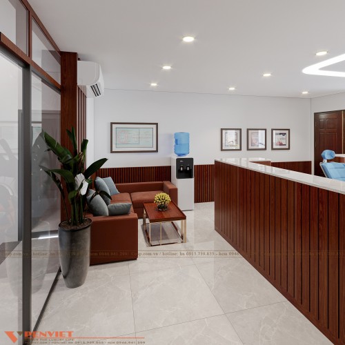 Khu vực tiếp đón khách hàng được Penviet setup giản đáp ứng công năng sử dụng, thiết kế phòng lễ tân sử dụng bàn trà với kiểu dáng bắt mắt và ghế sofa khung gỗ tự nhiên bọc nỉ, bàn trà khung sơn sắt tĩnh điện kết hợp với mặt bàn bằng gỗ mang đến sự thoải mái cho người sử dụng.