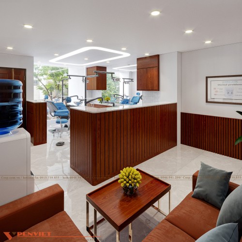 Kiến trúc sư Penviet sau khi đã nghiên cứu kỹ càng đã lựa chọn phong cách thiết kế phòng khám nha khoa hiện đại với màu sắc trắng và nâu chủ đạo. Màu trắng sẽ mang đến sự mở rộng không gian, giúp phòng khám được thông thoáng và rộng rãi hơn diện tích thực. Màu nâu gỗ được kết hợp sẽ mang đến sự ấm cúng, thân thuộc với khách hàng hàng.