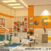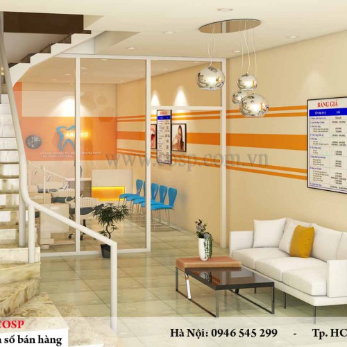 Thiết kế nội thất của phòng khám nha khoa Anh Tú đã sử dụng màu vàng cam làm chủ đạo kết hợp với logo màu xanh lam thể hiện một nơi làm việc năng động chu đáo của phòng khám.