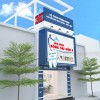 Tận dụng mặt tiền rộng và với chiều cao 3 tầng, kiến trúc sư thiết kế với 2 biển hiệu chính và biển vẫy. Thiết kế màu sắc tinh tế, hài hòa, logo được làm rõ nét, dễ đọc và dễ nhìn.