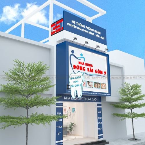 Biển hiệu chính thiết kế với kích thước 5000*800*3500 khung xương +alu. Nổi bật trên đó là bộ chữ mica “NHA KHOA ĐÔNG SÀI GÒN” có phát sáng. Chất liệu được lựa chọn này có độ bền bỉ theo thời gian, không bị phai màu hay xuống cấp. Các thông tin về địa chỉ và tranh ảnh về dịch của phòng khám được bố trí hợp lý góp phần tạo nên một mặt tiền chuyên nghiệp.