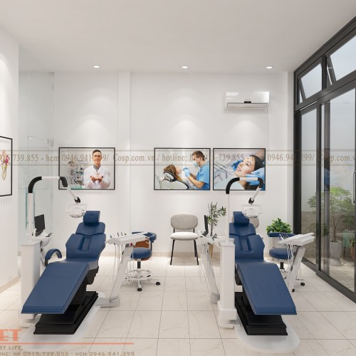 Thiết kế phòng khám nha khoa hiện đại, với 2 giường nha khoa. Phòng được trang bị thiết bị và đồ nội thất đầy đủ, bố cục khoa học đảm bảo quá trình thăm khám diễn ra trơn tru nhất.