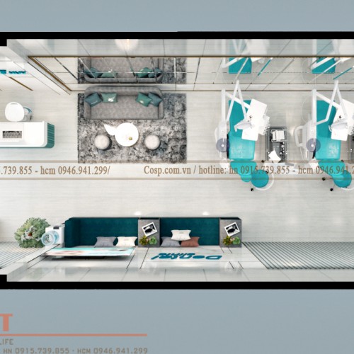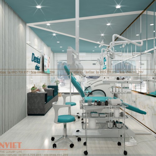 Thiết kế phòng khám nha khoa sử dụng 2 tông màu chủ đạo trắng và xanh. Màu trắng được sử dụng với mục tiêu mang đến cảm giác trẻ trung, hiện đại. Màu trắng còn có thể giúp không gian nhỏ hơn trông rộng lớn. Màu xanh được lựa chọn sử dụng ở nhiều chi tiết đồ nội thất để không gian không bị nhàm chán tạo cảm giác thoải mái cho người bệnh khi thăm khám.