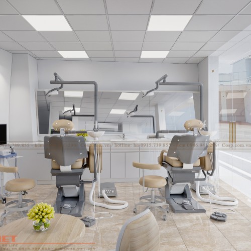 Khu vực thăm khám nha khoa được bố trí với 2 ghế nha khoa, cùng hệ nội thất bao gồm: Hệ tủ đựng gỗ MDF phủ melamine chống ẩm kết hợp với lavabo đặt áp tường khéo léo tiết kiệm không gian phòng khám. Và vách gương lửng được setup bên cạnh việc để khách hàng và bác sĩ có thể dễ dàng quan sát quá trình làm việc, thì nó còn giúp phản tạo ra phản xạ ánh sáng tốt khiến không gian sáng hơn.