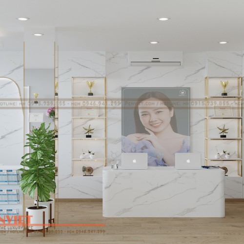 Kiến trúc sư của Penviet cũng đã tận dụng không gian để setup thêm bàn làm việc marketing bằng gỗ MDF chống ẩm, phía sau là vách trang trí và đợt trưng bày cúp mà phòng khám đạt được tạo điểm nhấn cho không gian.