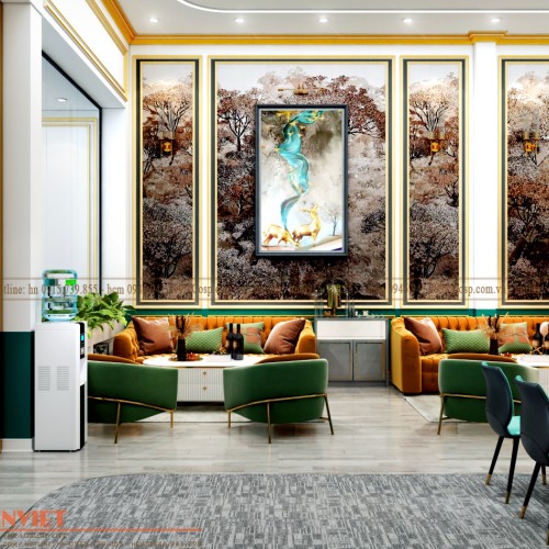 Khu vực tư vấn, Penviet sử dụng hệ bàn ghế sofa gỗ bọc nỉ mang đến cho khách hàng cảm thoải mái nhất. Bàn trà khung gỗ MDF mặt đá tự nhiên có ngăn kéo, chân và mép bàn bo tròn mạ inox vàng góp phần làm nổi bật thêm vẻ đẹp sang trọng. Không gian thêm phần hoàn hảo hơn với những chi tiết décor trang trí như tranh in pp, vách logo.