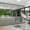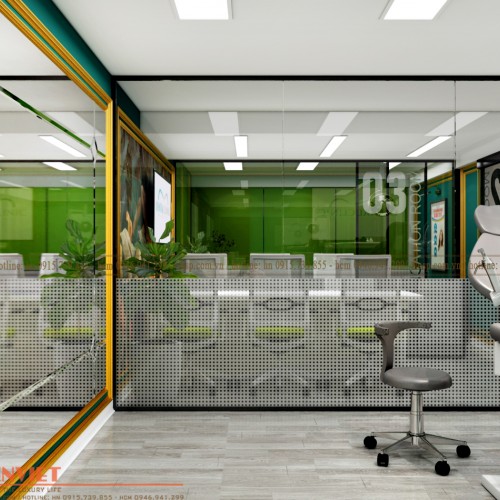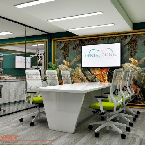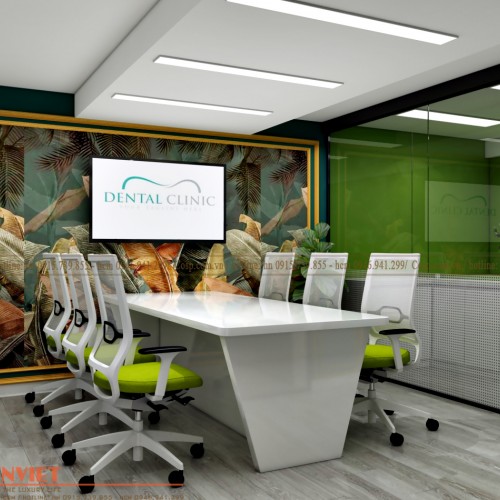 Thiết kế phòng họp tạo không gian mở để có thể tận dụng tối đa nguồn ánh sáng tự nhiên. Sử dụng cửa và vách kính cường lực kết hợp với ánh nhân tạo giúp căn phòng luôn trang hoàng ánh sáng phù hợp với tổng thể thiết kế phòng khám nha khoa.
