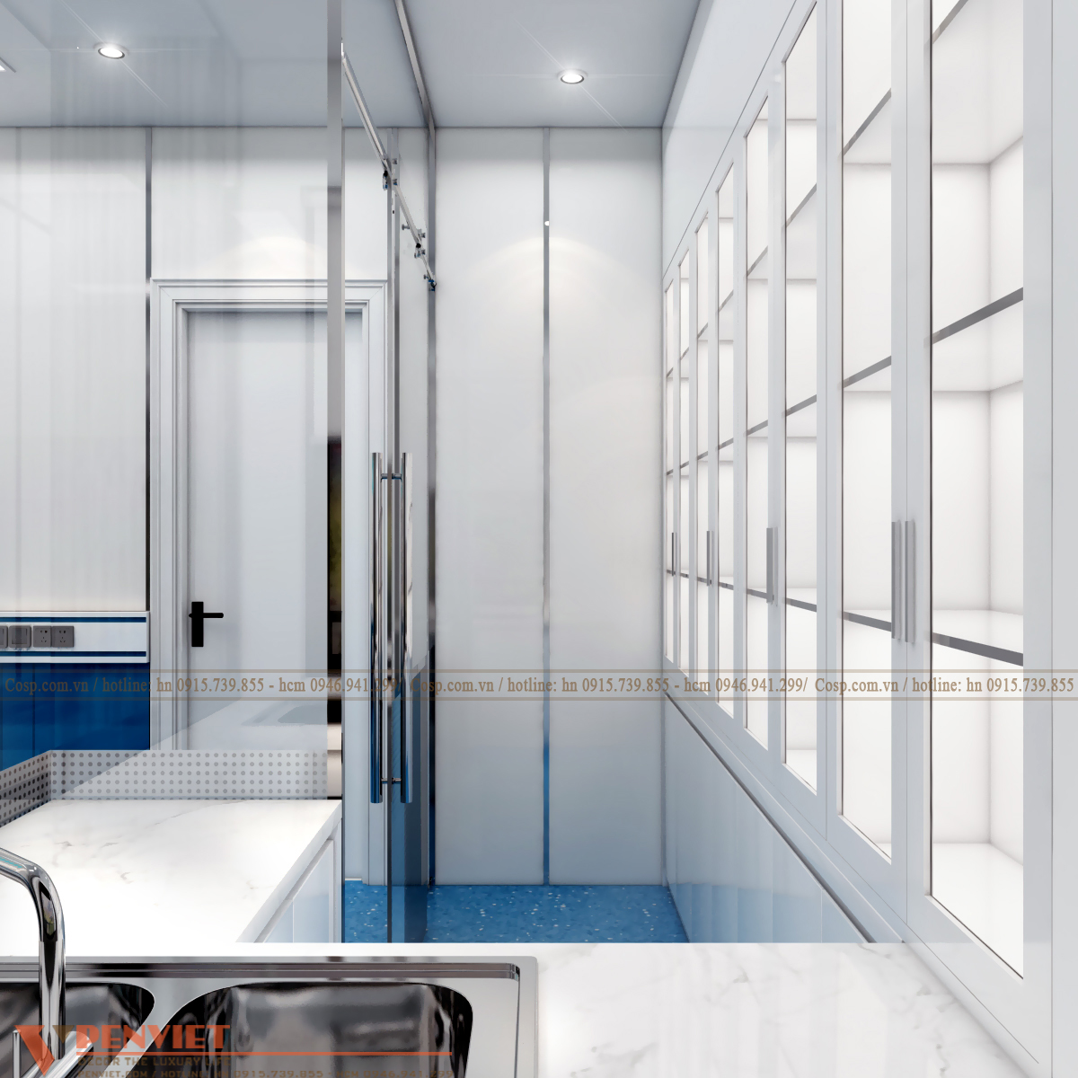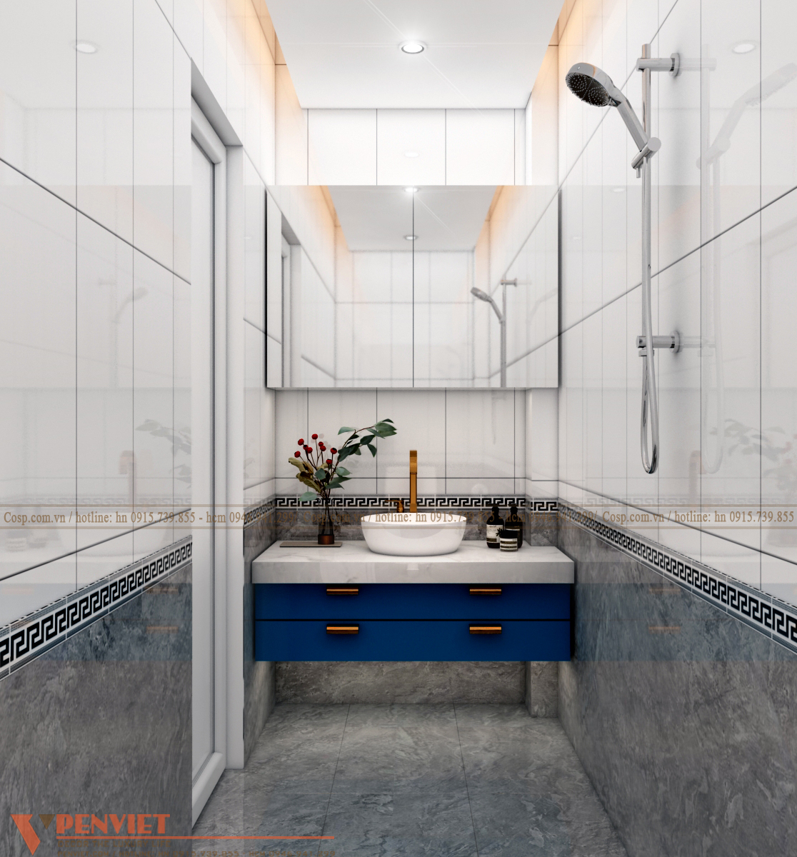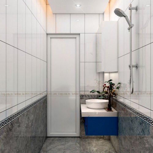 Không gian này chúng tôi chỉ tư vấn cho khách hàng cải tạo lại vách tường gạch bằng việc ốp alu màu trắng và xanh kết hợp. Hệ vách này vừa giúp không gian sáng hơn vừa dễ dàng vệ sinh lau chùi.