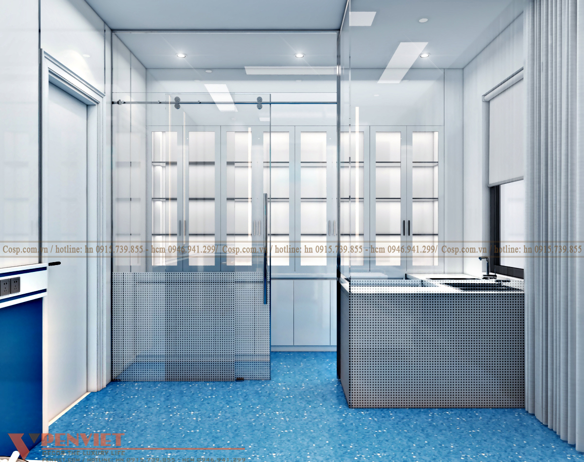 Thiết kế phòng khử trùng có diện tích nhỏ với hệ nội thất bao gồm tủ chậu rửa gỗ MDF cốt xanh Thái lan chống ẩm phủ melamin kết hợp gỗ nhựa chống nước. Và tủ đồ y tế Gỗ MDF cốt xanh Thái lan chống ẩm phủ melamin.