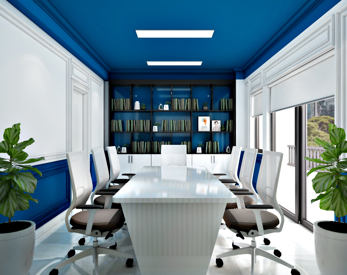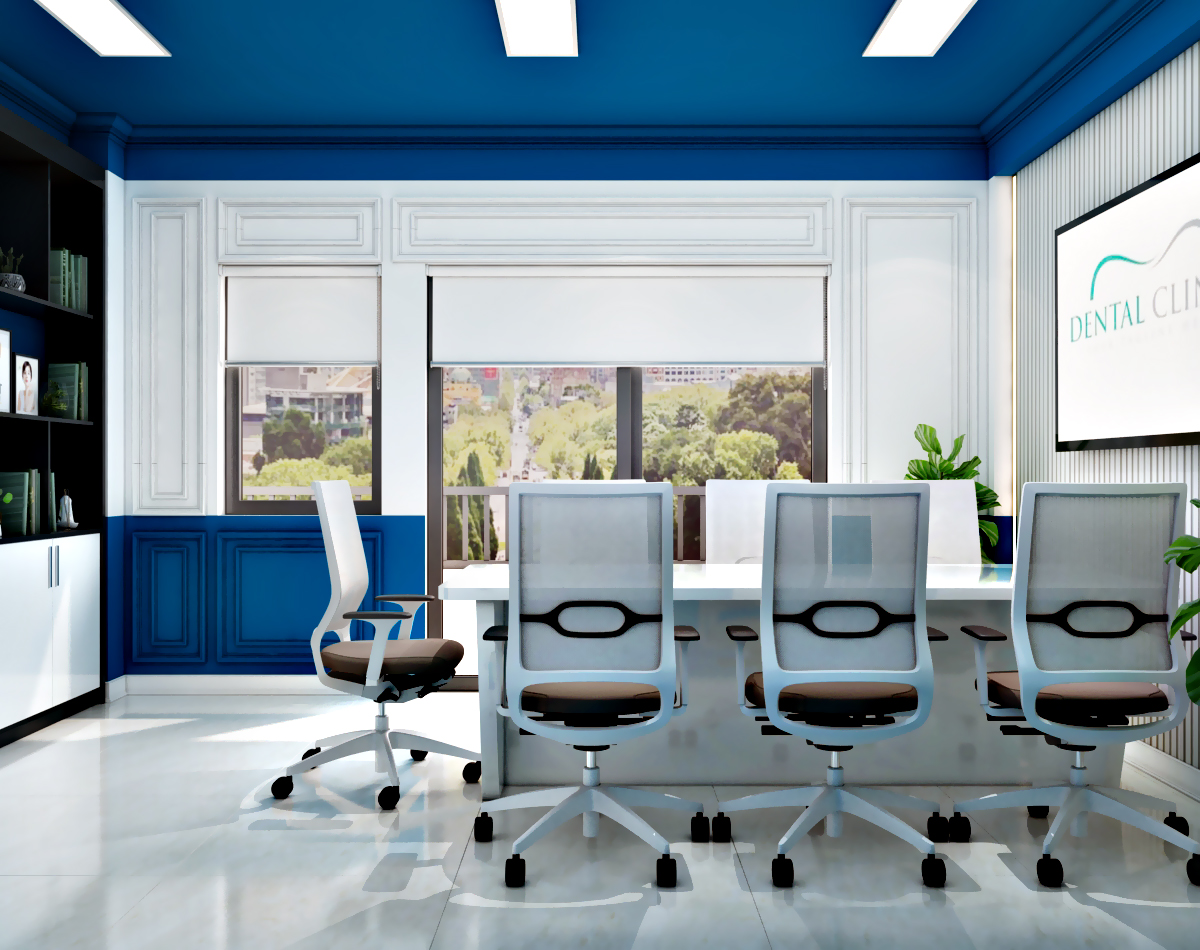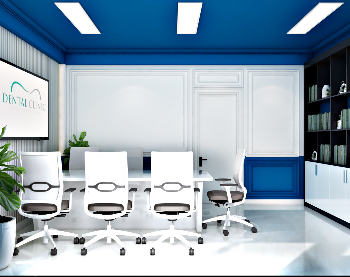 Phòng họp giao ban trong mẫu thiết kế phòng khám nha khoa Cộng Đồng được thiết kế phối hợp màu sắc tinh tế kết hợp nguồn ánh sáng tự nhiên tạo một không gian mở thoáng đãng.