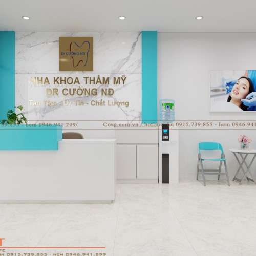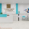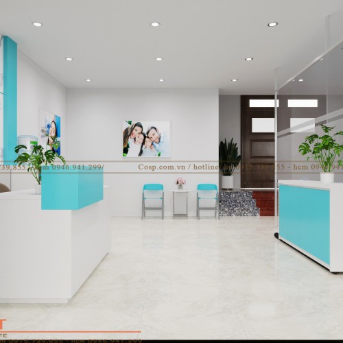 Thiết kế phòng lễ tân tông màu chủ đạo trắng xanh nhẹ nhàng và sạch sẽ. Thiết kế phòng khám bố trí một góc dành cho khu vực quầy thu ngân. Thiết kế quầy thu ngân với tone màu màu trắng xanh kiểu dáng hiện đại chuyên dụng. Phía sau quầy thủ ngân được thiết kế vách logo bằng nền MDF lõi xanh cốt Thái nhằm tôn lên chữ Logo bằng chất liệu mica.