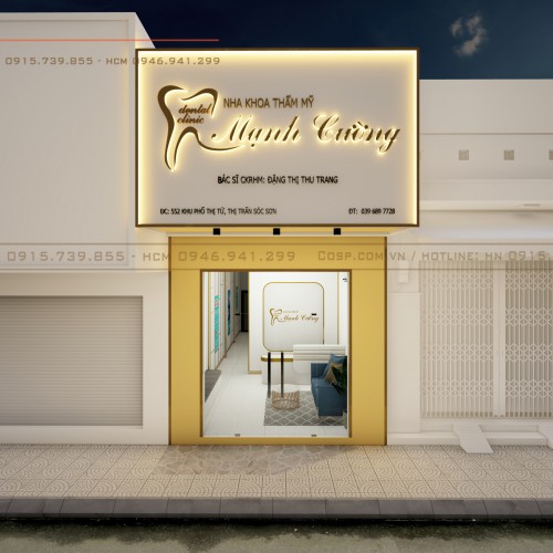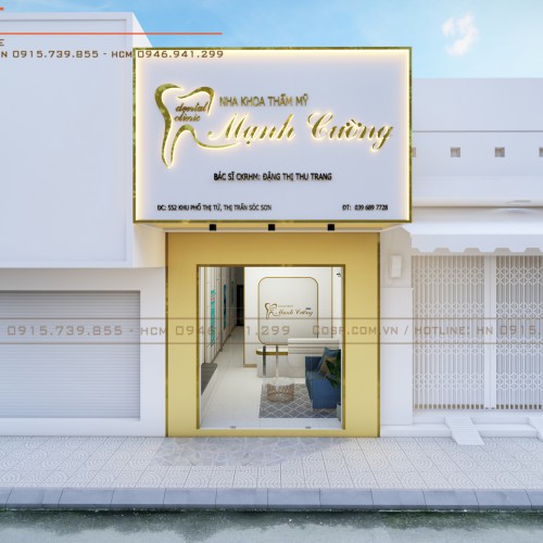 Mặt tiền phòng khám được thiết kế đơn giản, thể hiện sự nhất quán trong ý tưởng setup của kiến trúc sư, song vẫn tạo được sự thu hút nhờ việc sử dụng biển quảng cáo lớn bằng Alu kết hợp khung sắt gia cố với các chi tiết trang trí viền Alu vàng gold và đèn led hắt viền tôn lên bộ nhận diện thương hiệu bằng Inox mạ xi vàng uốn nổi, chân phát sáng và bộ chữ thông tin liên hệ bằng Inox mạ xi vàng.