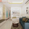 Quầy lễ tân bằng gỗ MDF chống ẩm phủ Melamine, mặt nhựa giả đá vân mây, nẹp viền Inox mạ xi vàng được đẩy về cuối căn phòng vừa tạo sự rộng rãi, thông thoáng, vừa giúp nhân viên dễ dàng bao quát toàn bộ khu vực này.